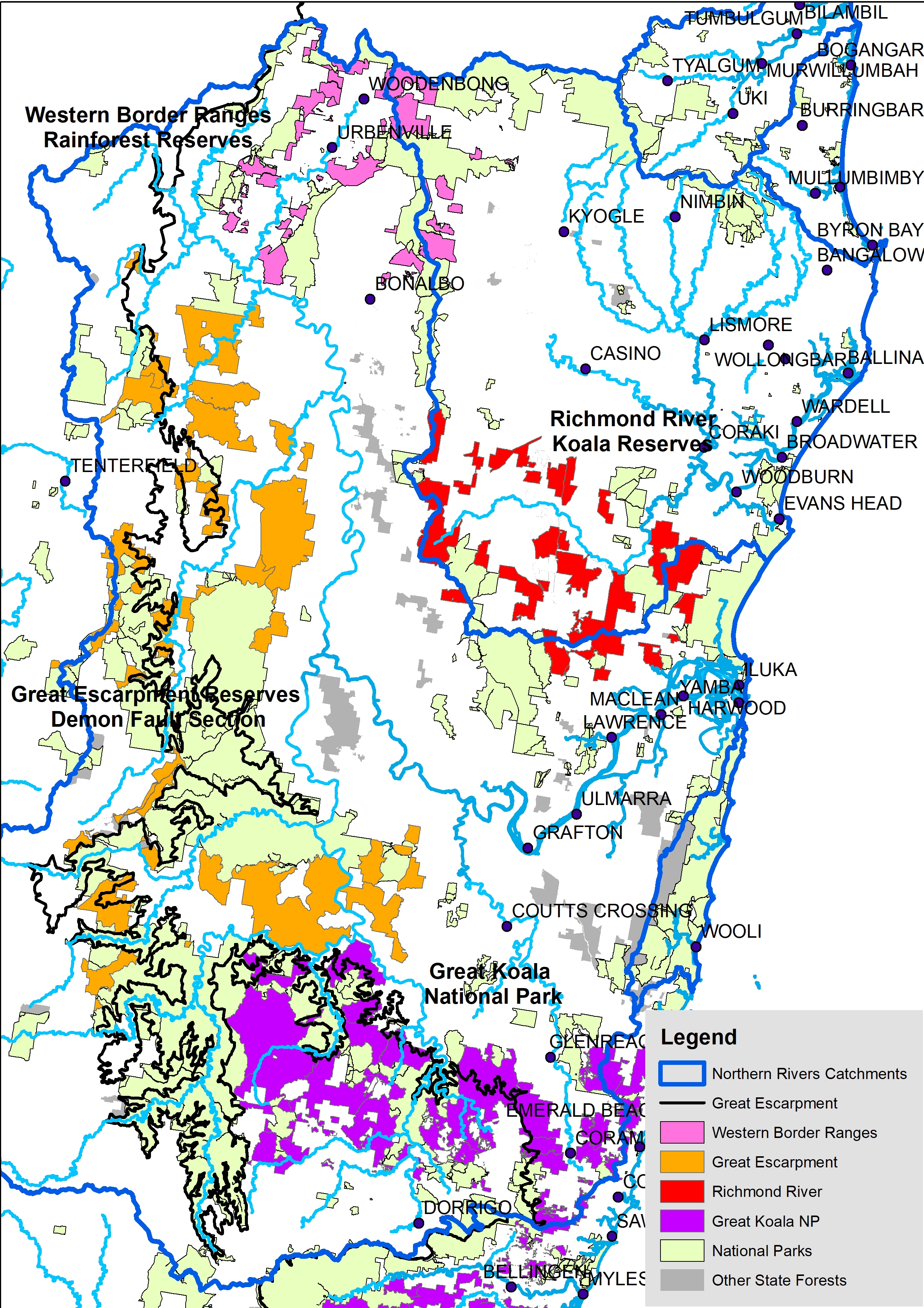 The catchments of the Northern Rivers (Clarence, Richmond, Tweed, Brunswick, and small coastal catchments south to Wooli Wooli River) encompass 3.1 million hectares. Within these catchments there 625,000 ha of National Parks (20%), and 509,000 ha of native State Forests (16%) that need to be protected and rehabilitated.