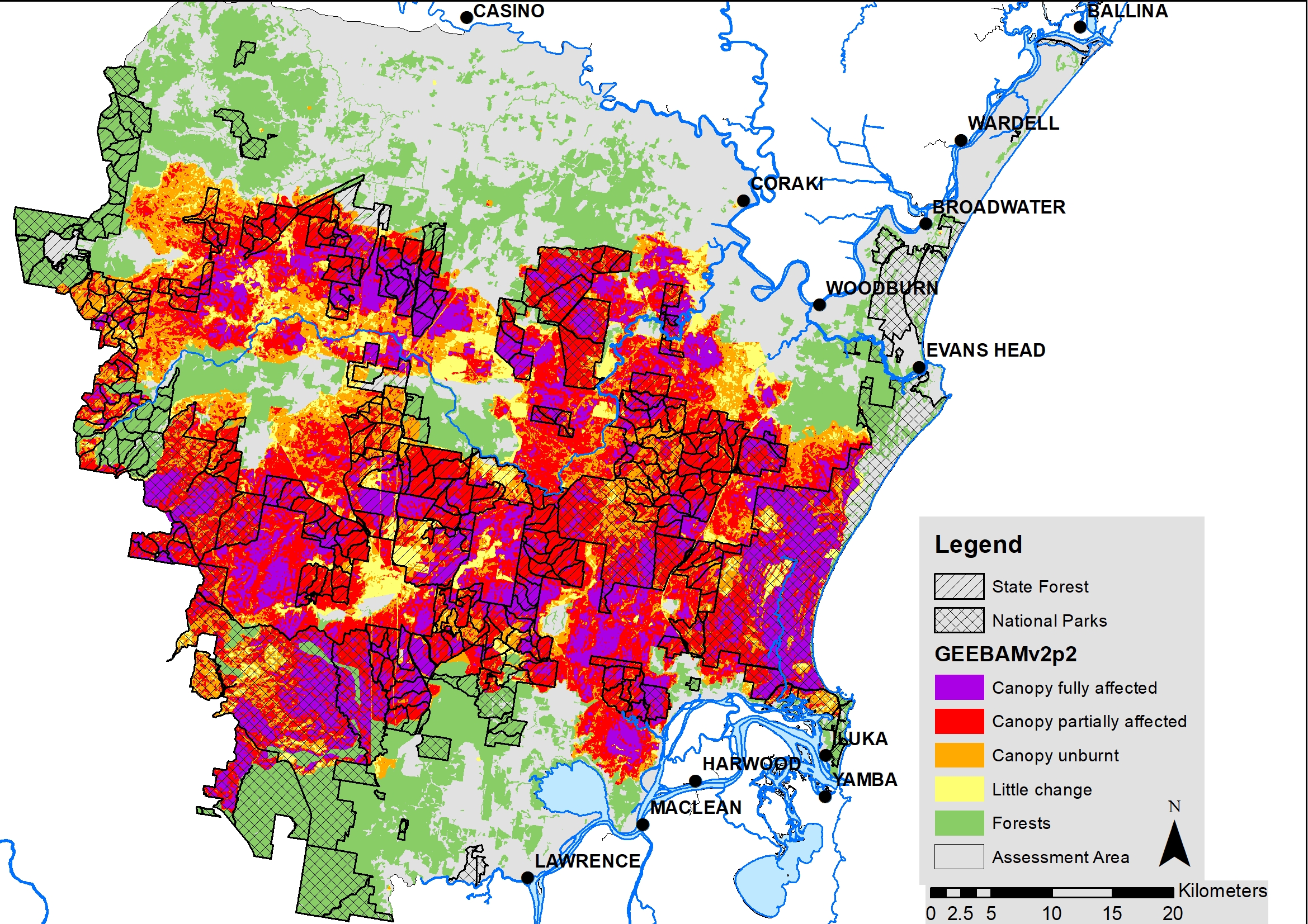 This population of Koalas was devastated by the 2019/20 wildfires, likely over half the population died, and many Koala feed trees were killed. Across the Richmond River Koala Parks 86% burnt, 18% intensively. Koalas are slowly recovering and again utilising most suitable habitat, though still in low numbers.
