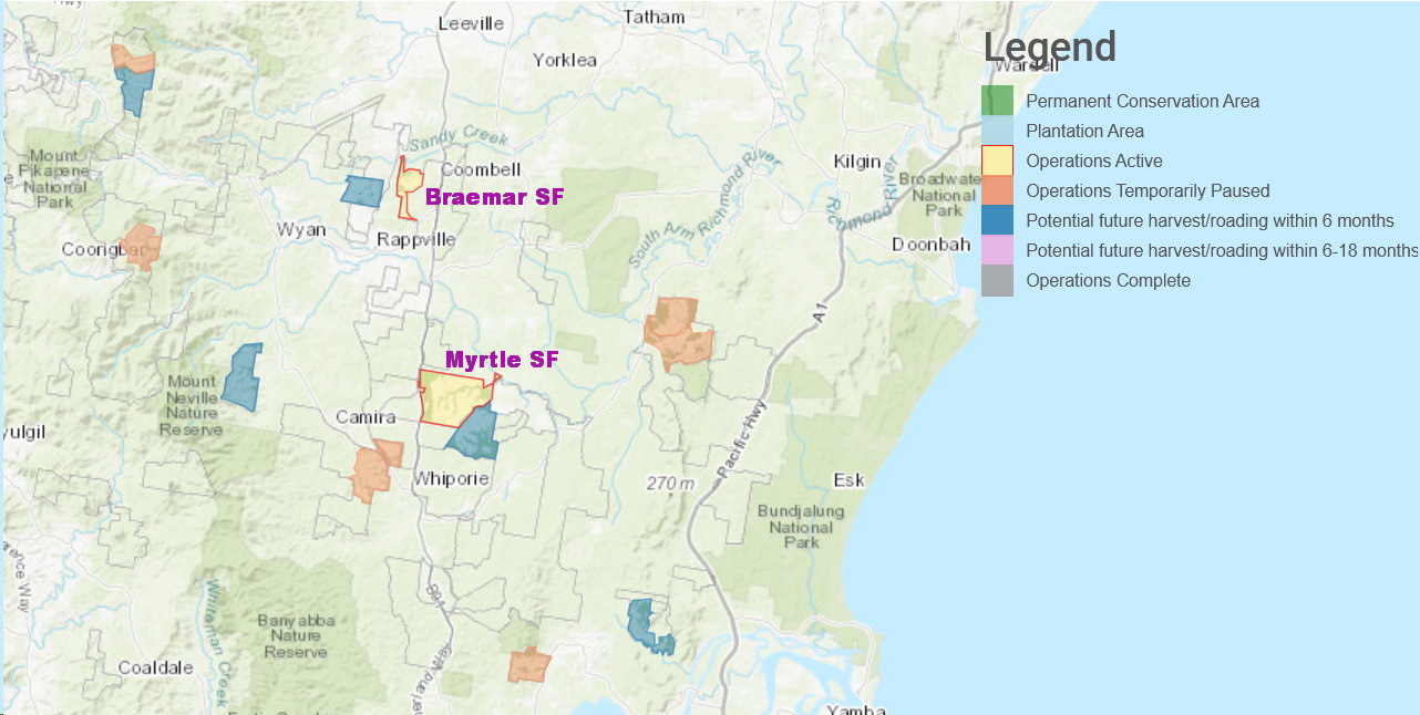 Now that the Great Koala National Park is off-limits, the Forestry Corporation is resuming logging of Koala feed trees in Braemar and Myrtle State Forests, in their operations removing over 75% of the mature feed trees Koalas need to rebuild their population.